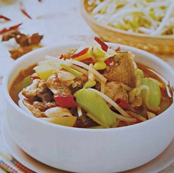 3放入鸡块,煸炒至略焦黄后加入高汤,煮沸,大火烧约30分钟。放入青笋块、芋头块、土豆块、黄豆芽,大火再次煮沸。
