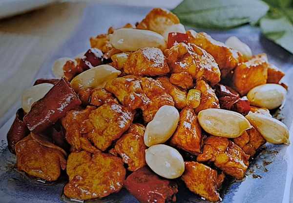 鸡脯肉500克、炸花生米250克