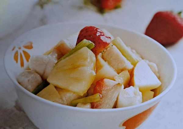4油锅烧至四成热,放入鸡丁滑散至熟,倒入菠萝丁、苹果丁、草莓块翻炒均匀,烹入味汁,收汁亮油,起锅装入盘中即可。