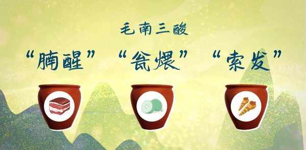 毛南族三酸在毛南语中称为“胃酸”、“翁煨”、“索发”。“醒肉”是一种以猪肉、牛肉片腌制为主的酸菜。“翁煨”是用瓜菜腌制的酸味食品,“索发”则多见于毛侬人家中。“索发”是一种用黄瓜做成的酸汤。汤很独特,其味酸爽,常为毛南人餐桌上的上宾。