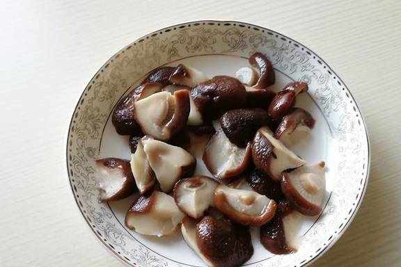 5.将香菇捞出晾凉,用刀将香菇片成片