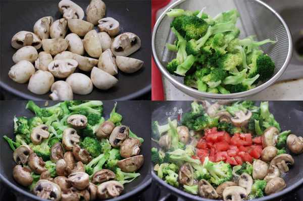 3、起锅倒油,放蒜末煸香,倒入西兰花、口蘑,炒两分钟左右。