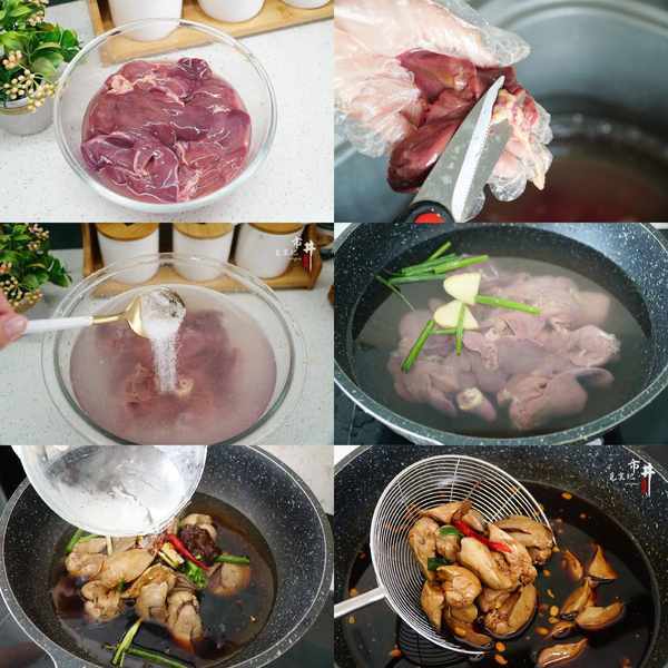 1、鸡肝处理清洗,用淡盐水泡半小时洗净。