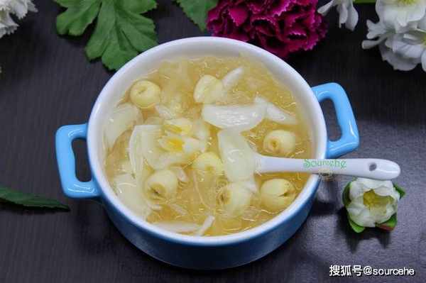 【银耳百合莲子糖水】银耳百合莲子,一年四季都可以吃,冬天热吃,夏天吃冰冷。食材:银耳、百合、莲子、糖。制作方法:银耳提前泡软,变大,捞出,清洗撕成小块。莲子、百合可以用新鲜,干百合、干莲子,需要提前泡软。锅里倒入适量的水,放银耳、百合、莲子、旺火煮沸,再小火慢煮20分钟,加点糖,煮至溶解。