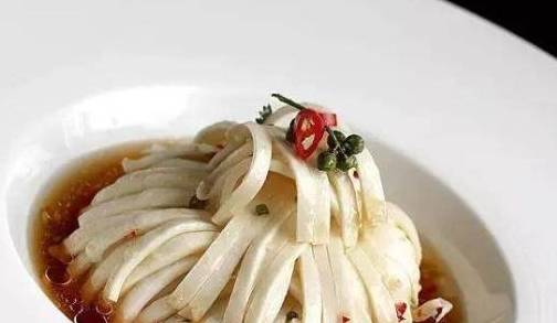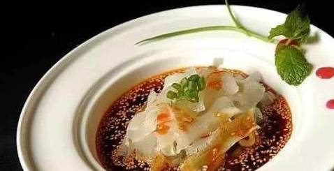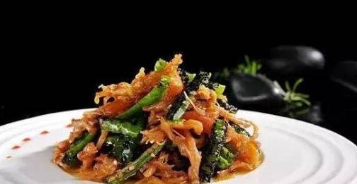 2,红鱼肚治净了切成薄片,放入加有盐和料酒的沸水锅,汆熟后捞出来投凉。黄山木耳先用热水涨发好,再与蕨菜一同投入沸水锅汆一水,投凉后放盘里垫底待用。