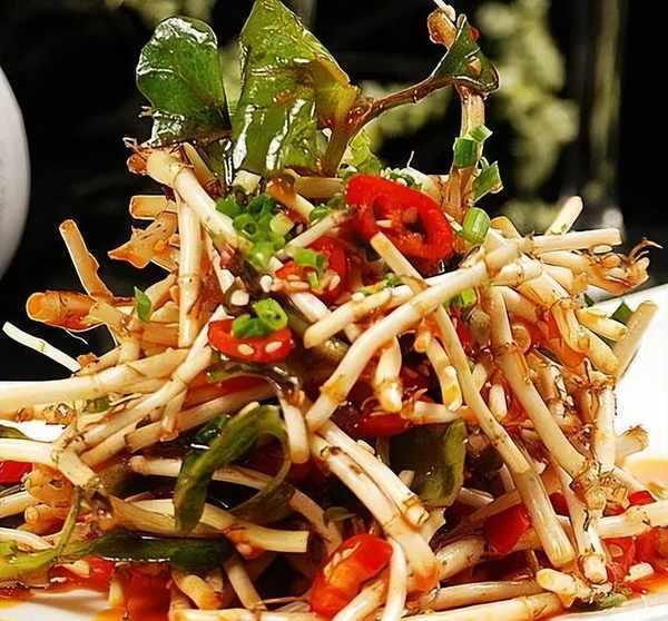 竹林下生长着竹菜(即鸭跖草),叶子像芹菜,丛大而茎叶细,长得很密。竹菜洗净,用开水焯一下,立即捞出,放入冷水中,挤去水分,切碎。取普丁、小蒜,开水焯一下,剁细,与竹菜拌匀,加盐、醋,盛半满即成。