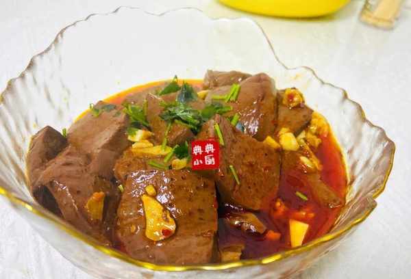 我们取油煮姜蒜,倒入鸭血,慢慢拌匀,加点酱汁,辣不辣,我加点辣酱,煮好后加红油。一些水