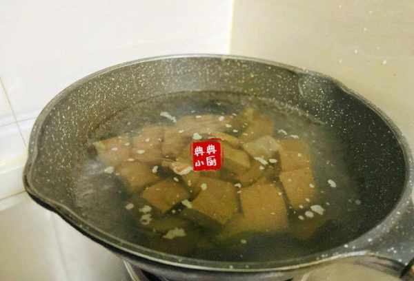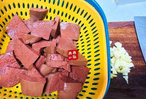 鸭血切块,放入沸水中焯一下。可先煮一会,再用清水洗净备用。