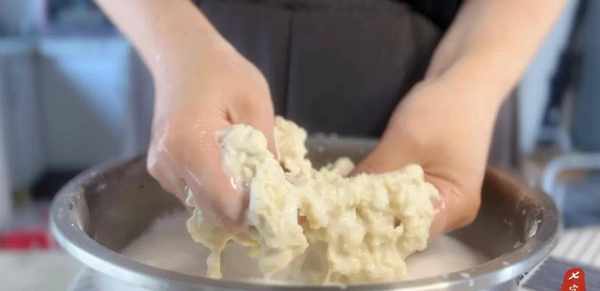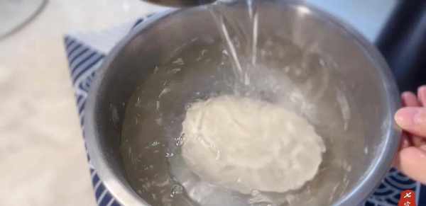 2、面团松散后,倒入清水,不要没过面团。