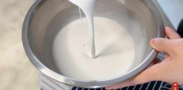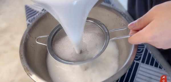 6、过滤所有洗好的面粉水。建议过滤两次,这样面团更细腻。过滤后的面粉水要放置5小时以上。春季可直接置于常温下。如果是夏天,应该放冰箱冷藏。