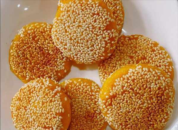 3、锅里放油,烧热。将南瓜饼一张一张放在上面,用小火慢慢煎。一定要用小火,否则会燃烧。煎至两面金黄,加少许水盖上锅盖。盖上锅盖小火炖两分钟(这样吃的时候口感会更软),揭开锅盖后,再炸两分钟,白芝麻南瓜饼就做好了。
