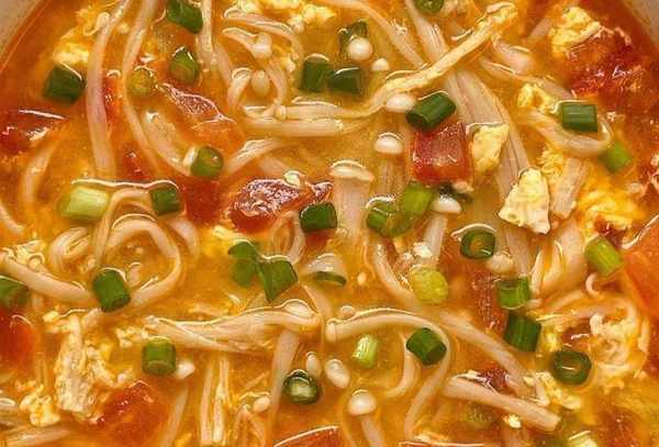 2.在平底锅中加热油。油热后,加入番茄块,翻炒片刻。汁煮熟后,加入足量的开水,用大火煮沸,然后加入金针菇煮约两分钟。3、然后倒入蛋液,煮至蛋液凝固,加入盐和胡椒粉调味,撒上葱花即可食用。