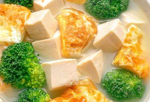 3.然后加入西兰花和软豆腐煮三分钟。煮好后加入盐和胡椒粉调味,搅拌几下即可食用。