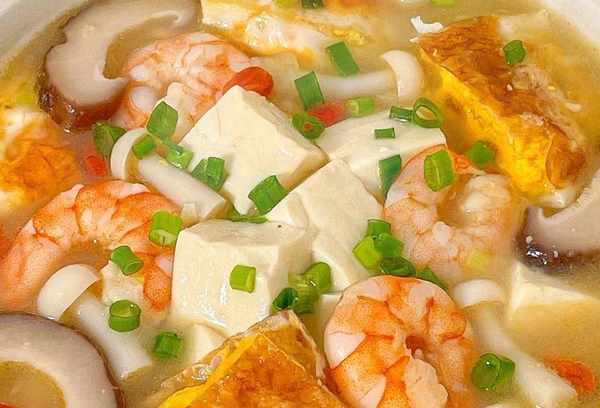 2.在平底锅中加热油。油热后加入鸡蛋炒熟,然后切成小块,加入足量的开水,用大火烧开。3、烧开后转中火,挤入虾块,煮至虾浮起,再继续煮两分钟。