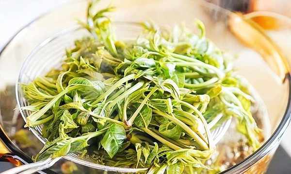 2、炒锅加入适量水,大火烧开。水烧开后,加入一克苏打水。然后将准备好的香椿芽放入锅中。用高温烫20秒,然后立即取出。在冷水中冷却。