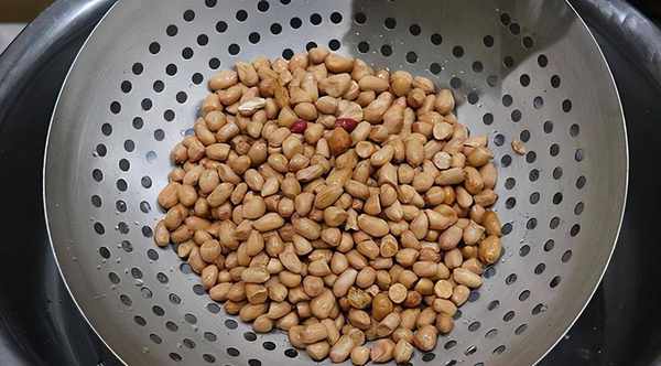 第四步:将准备好的花生和芝麻用清水冲洗干净,擦去表面的水分,然后将花生装入袋中,用擀面杖擀一下,将花生和芝麻一起放入锅中炒熟。炒出香味后,放入碗中,碗中加入适量白糖,拌匀,馅料就做好了。