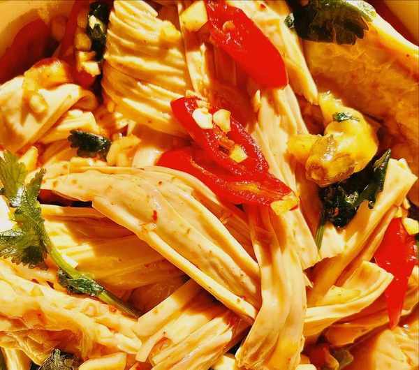 配料:腐竹、辣椒酱、香葱、红辣椒、藤椒油、香醋、白糖、生抽、香油。