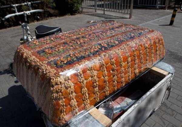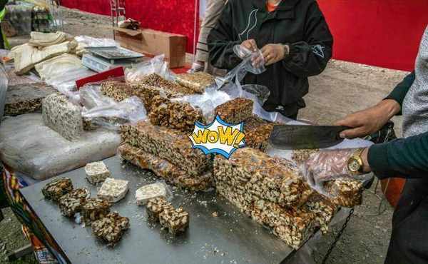 由于纯正的切糕所用材料非常丰富,有葡萄干、白芝麻、玫瑰、扁桃仁、大枣等高端材料,这种材料本身的价钱都相对比较贵,并且制作切糕流程十分复杂,必须耗费很多的时间精力,将材料碾成十分紧实一层一层,这同样是为何一小块切糕那么压秤,便是由于相对密度非常大。