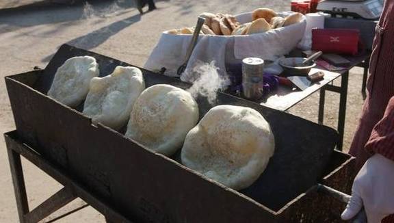 小哥特地选择了一块40厘米宽,120厘米长的铁板做烧烤平台,一次可以制作4个烧饼。一面完成后,小哥拧动把手将烧饼翻进烤箱里,用炭火进行烘烤。翻出来的铁板另一面可以再制作4个烧饼,这样就相当于一块铁板使用上下两面同时制作8个烧饼,效率十分惊人。烧饼烤到冒气泡时,在表面刷上一层蜂蜜,继续翻动烤制,就会产生一层十分漂亮的金黄色表皮,这也是烧饼最好吃的地方。