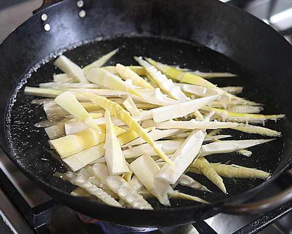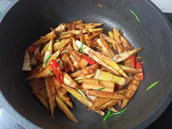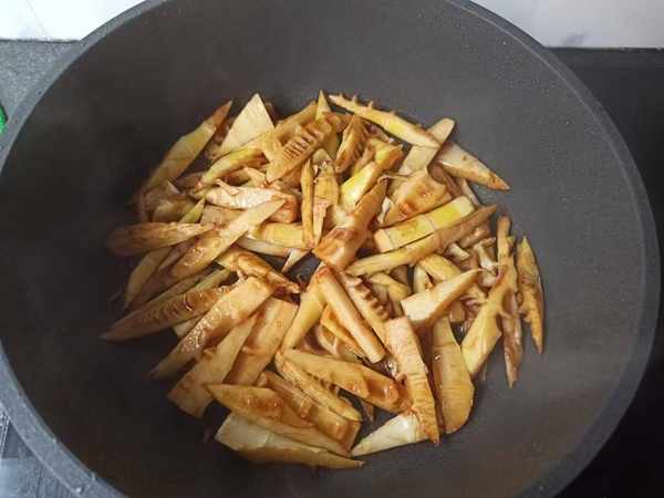3、起锅烧油,将春笋倒进锅里,调入老抽,生抽,一点料酒,翻炒至上色,继续加入一些高汤或热水,焖两三分钟,将笋彻底焖熟。
