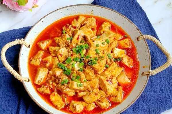 材料:豆腐、瘦肉末、豆瓣酱、花椒、蒜末、葱末、生姜末、盐、糖、鸡精、植物油、水淀粉。