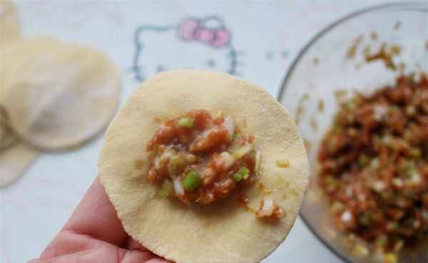 6、挖一勺馅料放在面皮上,馅料不要太多。
