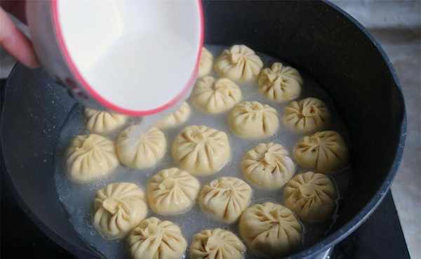 8、平底锅里放入少许油,把小包子放进去,先煎1分钟定型。