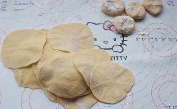 5、面剂子按扁,擀成边缘略薄中间厚的面片。