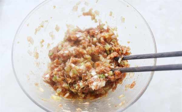 3、面团醒发的时候来拌馅。肉馅加入葱姜末和所有调料拌匀,再加入芹菜末拌匀,馅料就做好了。