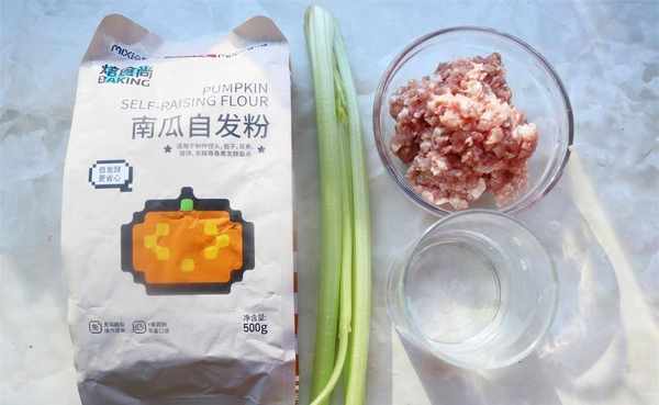 材料:南瓜自发粉200克,水105克,猪肉馅150克,芹菜100克,葱姜末适量,生抽10克,蚝油10克,五香粉少许,芝麻油15克。
