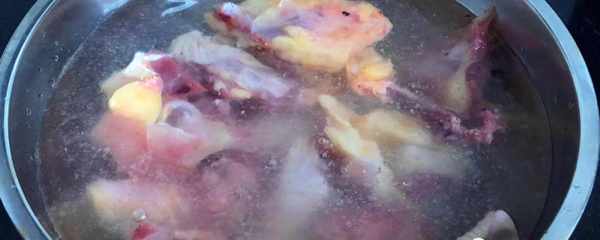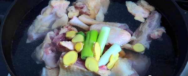 第4步、把浸泡好的鸡肉清洗干净后,冷水下锅,放入姜葱和料酒进行焯水,水开后,把表面的浮沫去掉,再煮上几分钟再捞出用温水清洗干净备用。这时候香菇也泡好了,也清洗干净备用。