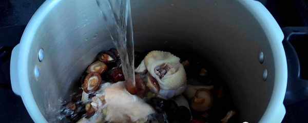 第5步、准备一个高压锅,然后把鸡肉和香菇,红枣,当归,黄芪放入,再倒入适量的温水或者开水,盖上锅盖,中小火煮上20分钟左右。