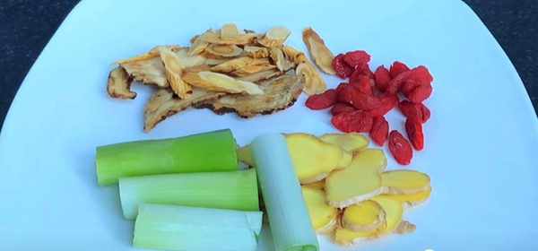 第3步、这时候也有时间去准备一些配料了,姜片,葱段,枸杞,当归和黄芪。