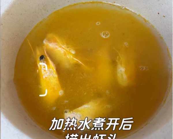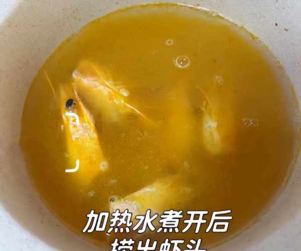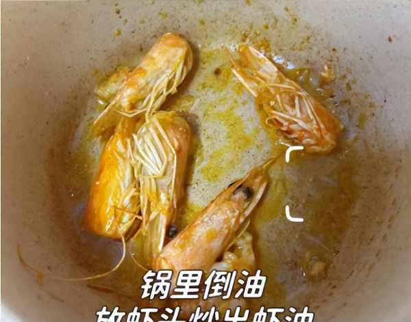 步骤4:锅底调入一些食用油,倒入一些虾头煸炒出油脂,加上一些姜丝煸炒一会儿,加上适量开水(也可以用清水煮沸),捞出里面的虾头。