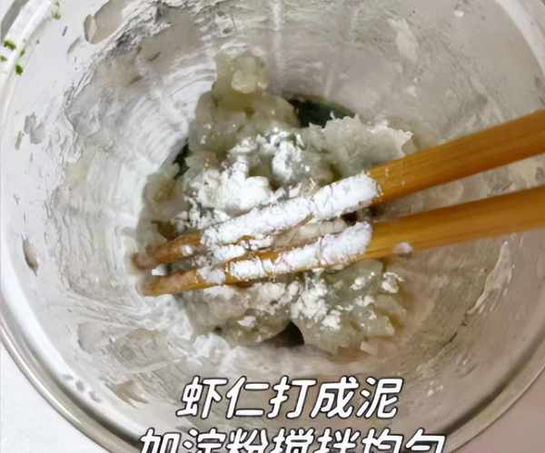 步骤3:将大虾的虾头和虾尾分开,虾壳要全部剥掉,尾巴的虾线要挑出来,虾肉用刀剁碎,虾肉泥放在容器里,加上少许葱姜水和食盐,加上半勺料酒,用手搅拌均匀,准备好一些虾滑,开始制作这款菠菜虾滑粉丝汤吧。
