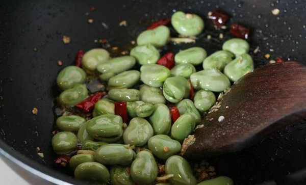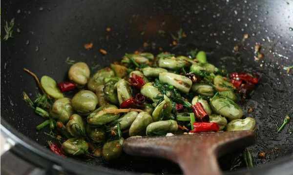 第五步:调到大火之后,倒入蚕豆快速煸炒至断生(也可以将蚕豆提前焯水处理),倒入一些茴香菜,中小火翻炒均匀。