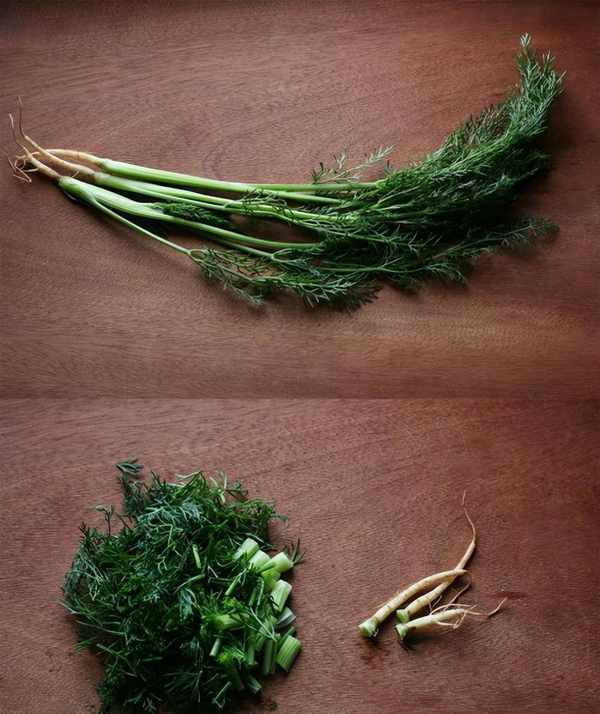 第二步:将茴香菜的根部切掉,用清水冲洗干净,用盐水浸泡一会儿,去掉叶片的有害物质,沥干水分,切成若干小段,备用。