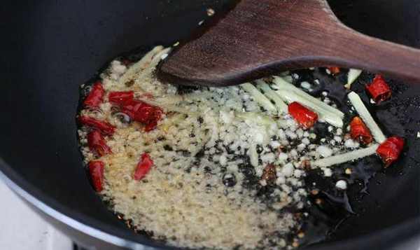 第四步:锅底调入少许食用油,等待油温慢慢变热,加上蒜末,干辣椒和生姜丝,快速爆炒出蒜香味。