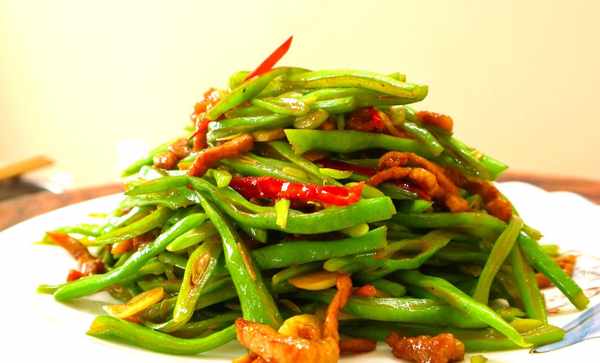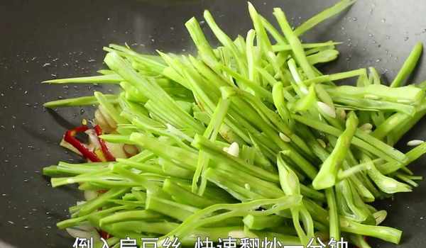 3、锅里再加少许食用油,放入葱姜蒜和干辣椒爆香,倒入扁豆丝,翻炒一分钟,扁豆丝炒至断生。