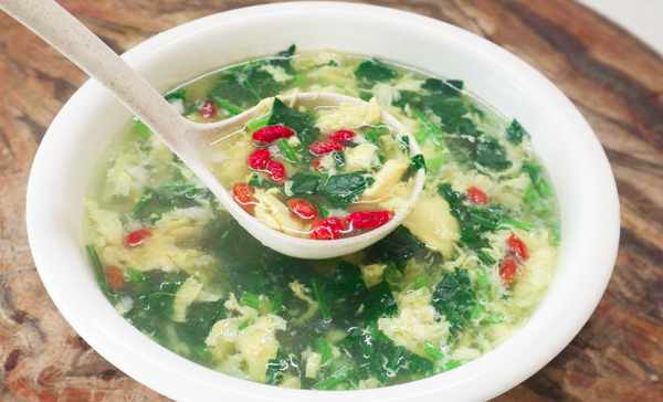 2、起锅加适量清水,将山药泥下锅,水开后下入菠菜,搅拌几下,加一勺食盐,半勺鸡精,改小火淋入鸡蛋液,静置10秒钟,等鸡蛋花定型以后,用勺子轻轻推动几下。