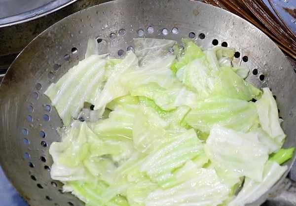 2、起锅烧水,加一勺食盐,少许植物油,水开后把包菜下锅,推动几下,焯水30秒捞出控水过凉。