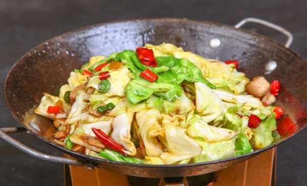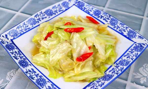 3、另起锅加半勺食用油,倒入蒜片,花椒和辣椒爆香,然后下入包菜,大火快速翻炒几下,从锅边烹入少许白醋,翻炒均匀。