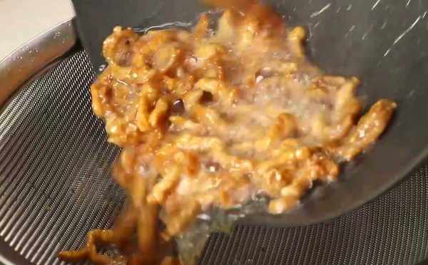 2、锅中加两勺食用油,油温4成热时,下入肉丝,用筷子搅散,滑油30秒,即可捞出控油。