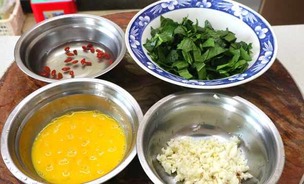 两个鸡蛋,打入碗中,加入几滴白醋,少许胡椒粉去腥,搅匀打散;一小把枸杞子,用清水浸泡5分钟。
