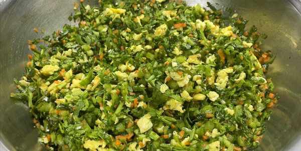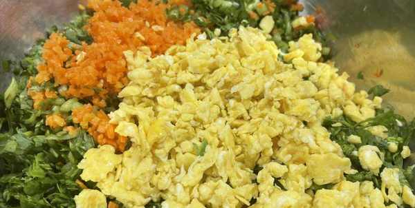 操作步骤:将茼蒿洗干净控水,水分控好后切碎;准备几个鸡蛋,打散后搅拌均匀,炒成鸡蛋碎,胡萝卜改刀切片后切丝,再切成碎块,切好后,先用食用油炒一炒,然后一起拌馅。