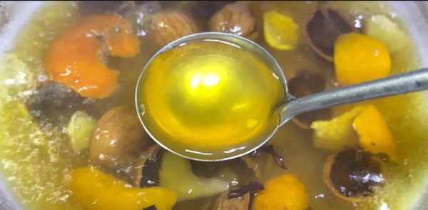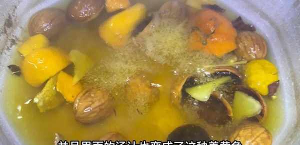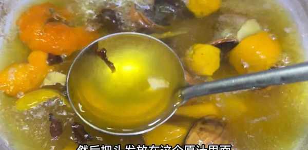 用勺子轻轻搅拌,然后盖上锅盖,中火煮15分钟,将所有食材中的有效成分完全注入水中,煮15分钟后闻一下陈皮、生姜和核桃的香味。强烈的气味它的气味,还有里面的汤汁,都变成了这种姜黄的颜色,和橘子皮的颜色很像。截然不同的是,这样煮完后,我们可以关火,然后直接用开水洗头,而且不想过滤掉里面的物质,因为煮了15分钟后,所有物质的养分都已完全注入糖水中。