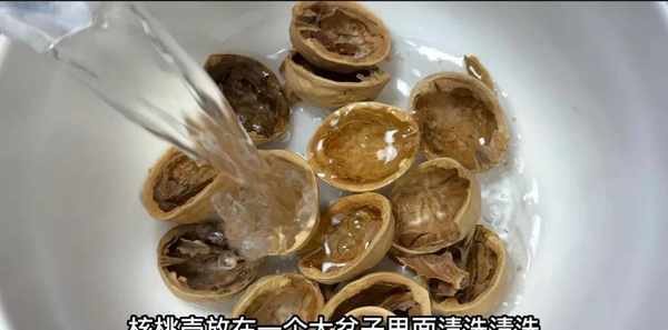 核桃壳含有丰富的维生素B、维生素E、微量元素等营养成分。我们可以充分利用这些营养素。拿去洗净,洗完后检查水分,去掉坚果壳洗净。他会做一次。