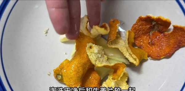 洗净并与姜片混合。这时候,锅里的坚果水已经烧开了。倒入橙皮和姜片继续煮。