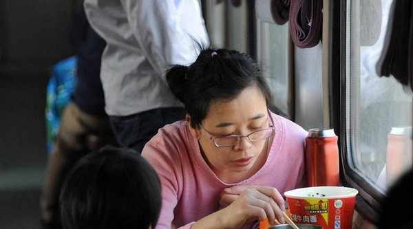 还有一点,火车是封闭空间,尤其是普通火车,排风系统并不是很完善,导致火车内空气流通不畅,整节车厢里的味道可以用怪异来形容。加上火车内乘客较多,只有一个小桌板供4至6个人使用,就餐环境可以说是恶劣。乘客大多数也没有心情在火车享受美食,大多数抱着在火车上将就一下,下车了就可以饱餐一顿吃美食的想法,而选择用自带的泡面、零食等,吃饱肚子就行。