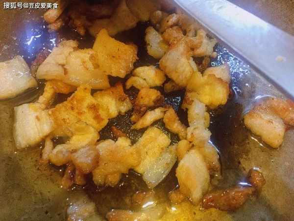 3、起锅烧油,下入五花肉,煎至出猪油,把五花肉盛出备用。